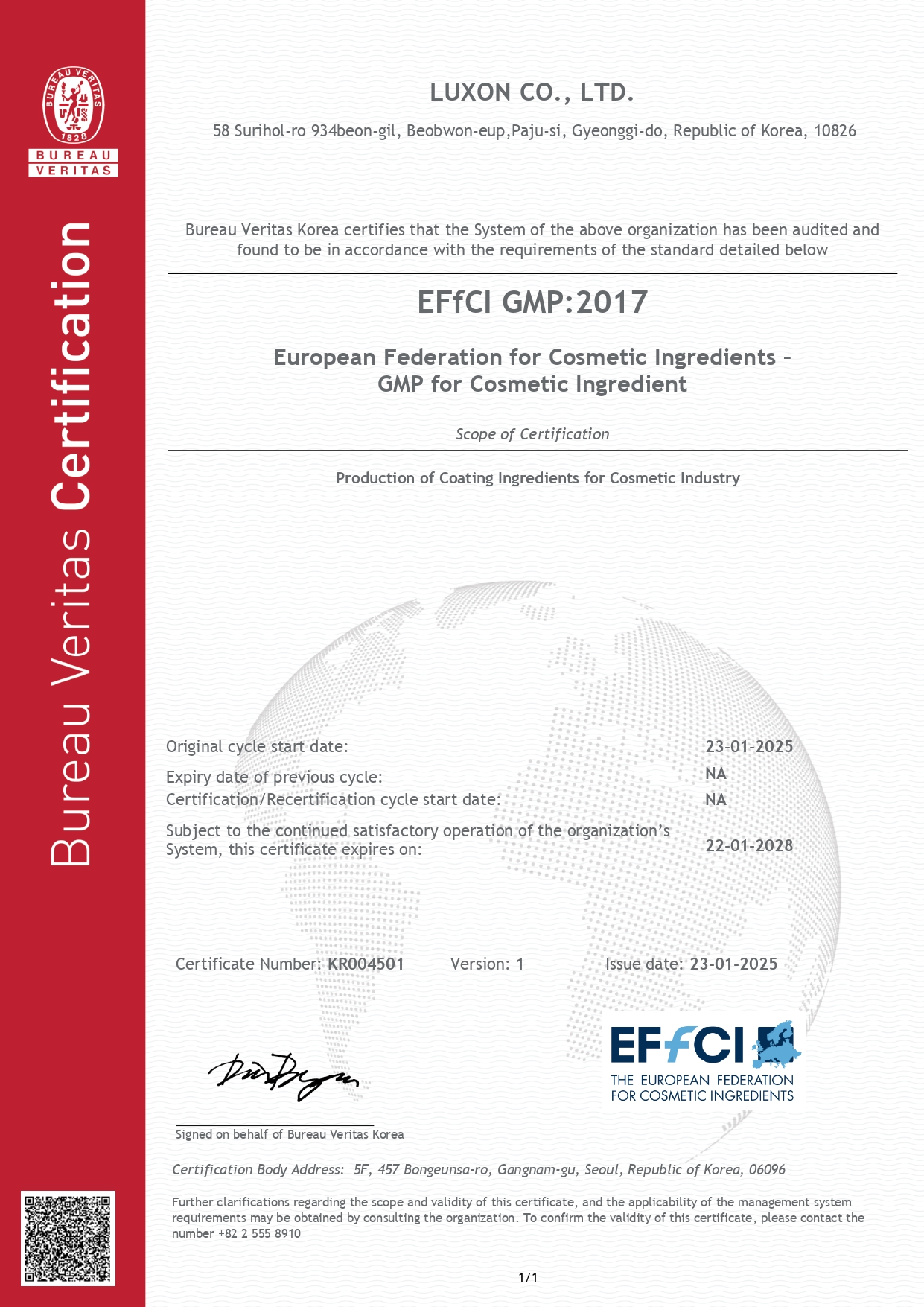 We are happy to inform you that Luxon's production has received facility accreditation from the European Federation for Cosmetic Ingredients (EFfCI-GMP: European Good Manufacturing Practices for Cosmetic Raw Materials).